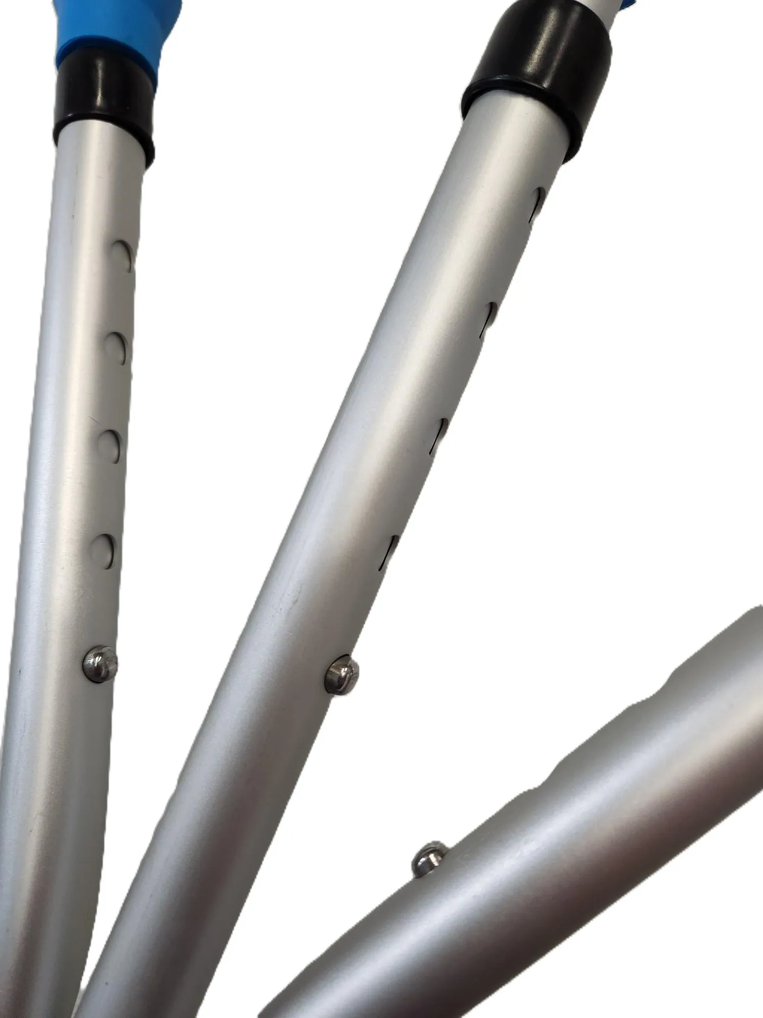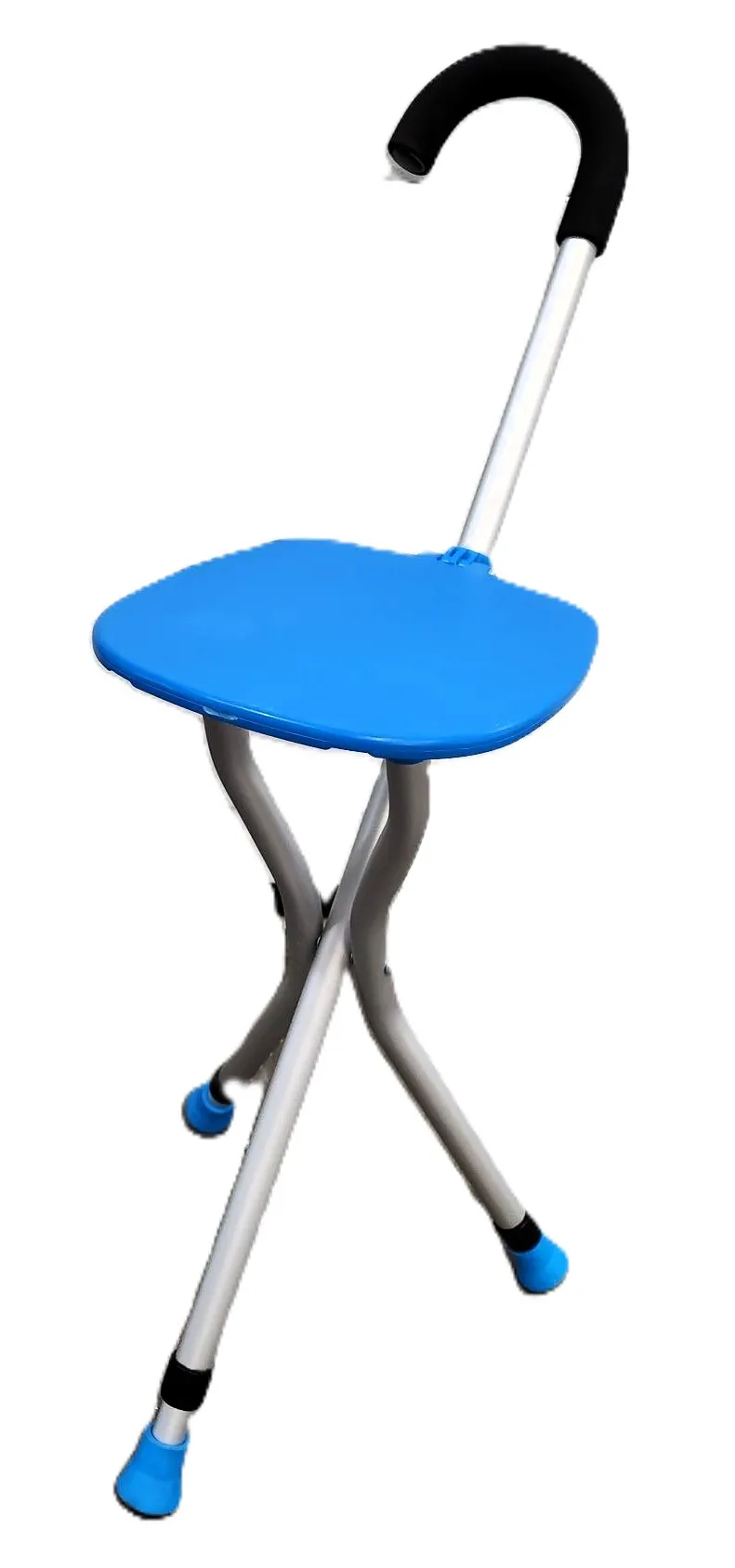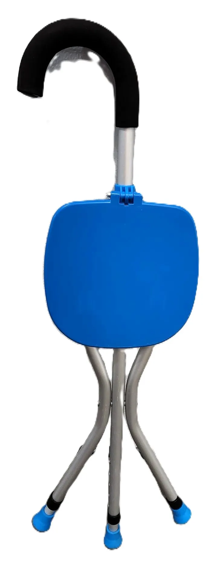 Adjustable aluminum walking stick with seat. Folds out to make a chair to sit on.
