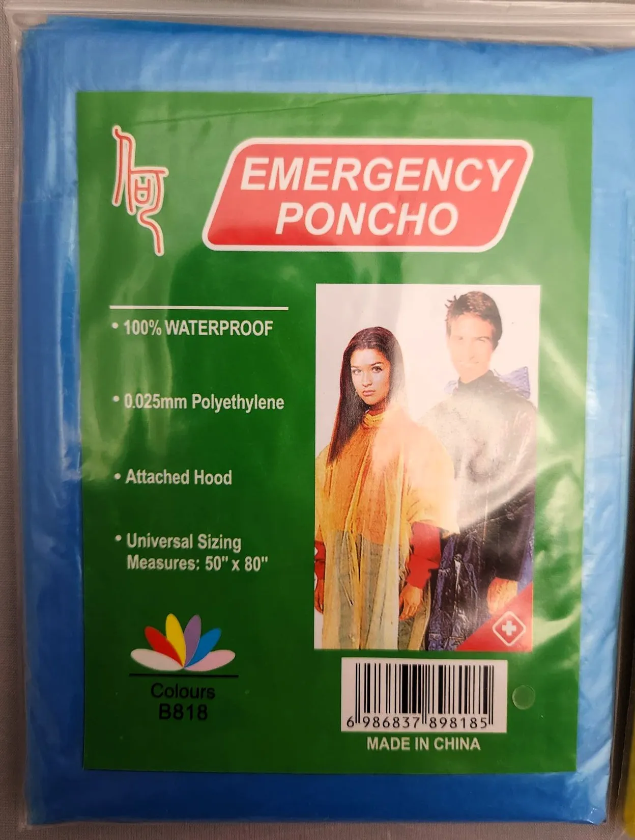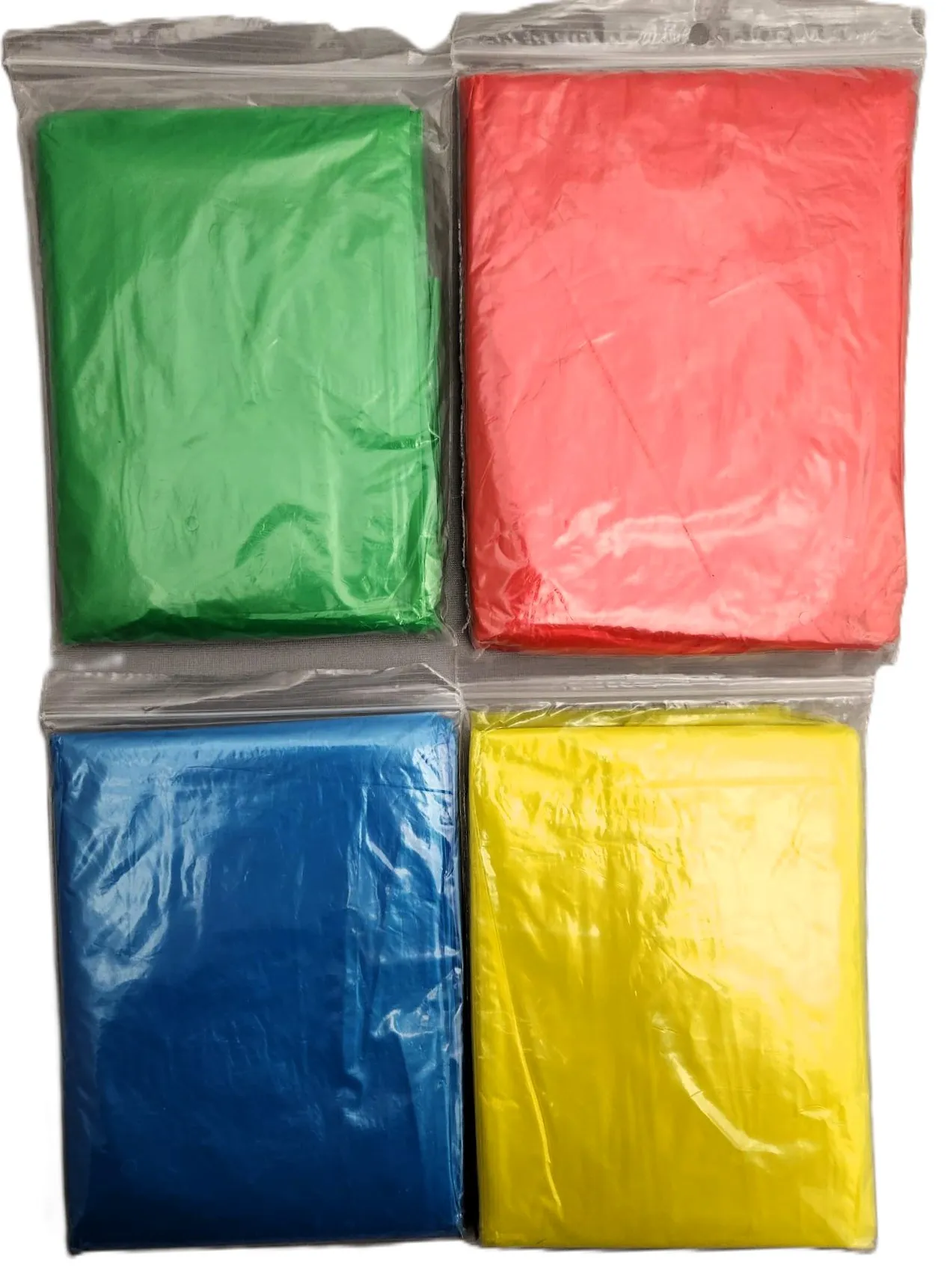 Assorted color poncho rain coats that are 0.2 mm thick in a poly bag. Colors come assorted of green, yellow, blue, and red.