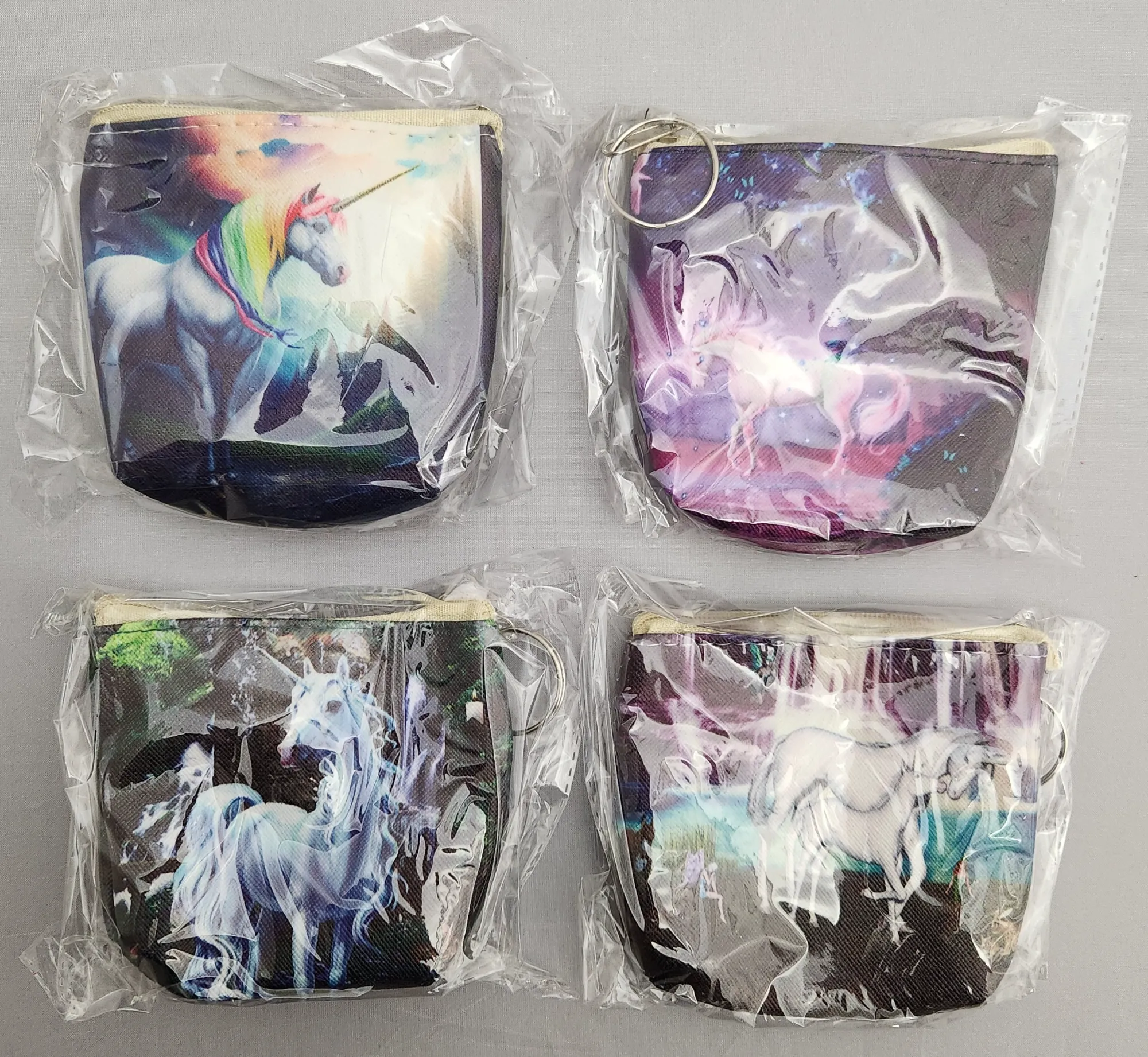 Unicorn Coin Purse with zipper. One Piece per poly bag. 4 Assorted Designs